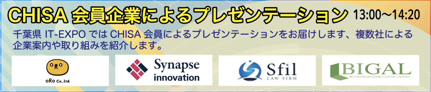 千葉県IT-EXPOではCHISA会員企業によるプレゼンが行われます。企業案内や取り組み、商品紹介やイベントの告知などが、複数社から行われます。これを機会に事業コラボレーションや協業など、直接の商談を進めることが可能となります。